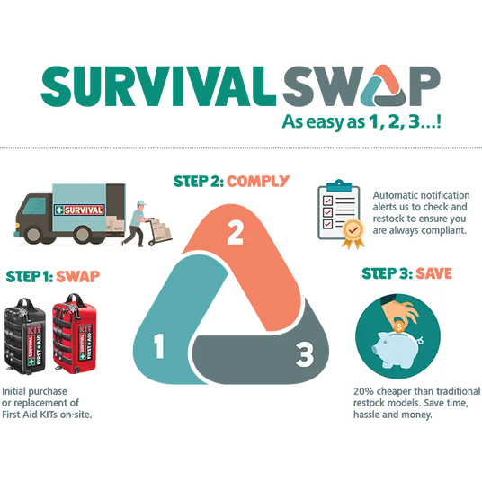 SURVIVAL SWAP is a fully automated, cost effective, contact-free first aid system that ensures your business remains fully stocked and compliant at all times.