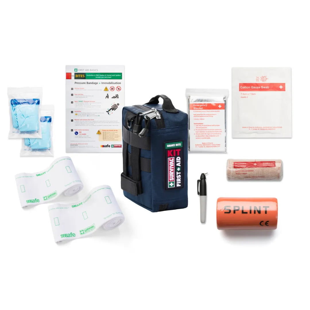 The Snake Bite KIT is specifically for treating snake and spider bites and has a splint which is crucial for immobilising a limb for a snake/spider bite.
